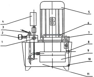 1、安全閥2、出油口(M14X1.5或JZT-Φ6膠管插座)3、卸荷閥4、壓力表 5、電機6、手把7、空氣濾清器8、油窗9、高壓泵10、放油螺11、油 箱